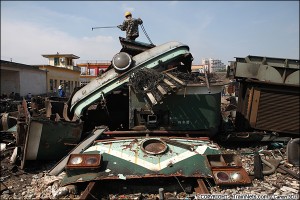 广铁的SS1开始拆解。肢解工作从上到下,从外到内。车体外墙被分割成一片片大小相近的铁皮。工人对拆下来的大部件进行进一步地分解分类,细致得连螺丝螺帽,电器元件内贵金属的都要拆下来回收。138吨的庞然大物,就这样被细细地分成各种碎片,不留任何痕迹。