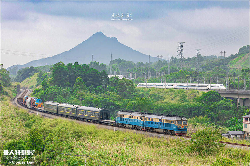2024年8月13日,湘桂线。超级超限列车70001次蜿蜒行驶在广西境内,与一旁的衡柳线CRH2A并驾齐驱。