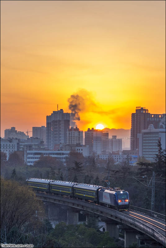 2016年12月22日。陕西宝鸡。8359次(宝鸡-元龙)列车在晨光中经过西关大桥。(图/Joan)