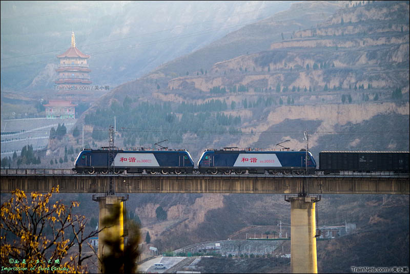 2017年2月25日。陕西省渭南市沋河大桥,双机HXD3牵引下行货列通过陇海线1013公里处。(图/关小鹏)