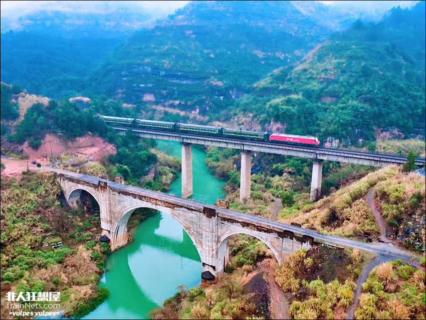2017年1月。广东省韶关市坪石。新京广线列车驶过老粤汉铁路省界桥。
