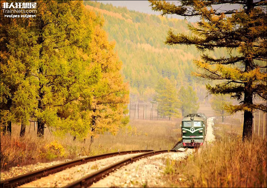 2016年9月。内蒙古自治区牙克石市博克图镇。小票车行驶在牙林线的缓坡上。