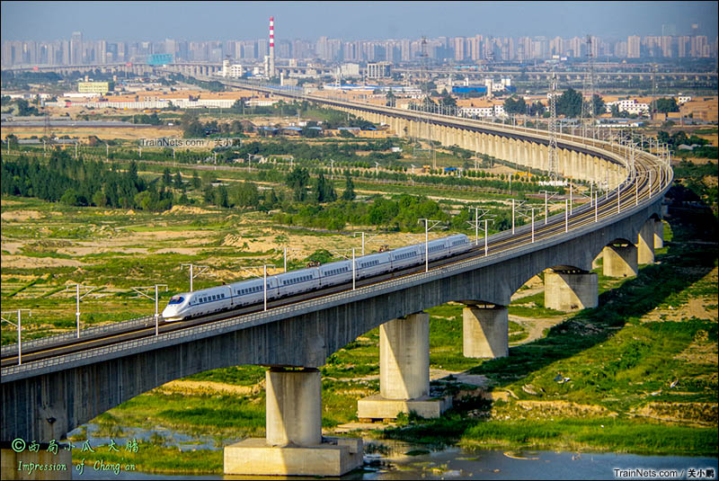 2016年7月5日。陕西省咸阳市。CRH2A担当D2564次(宝鸡南-太原)通过徐兰客运专线渭河大桥。(图/关小鹏)