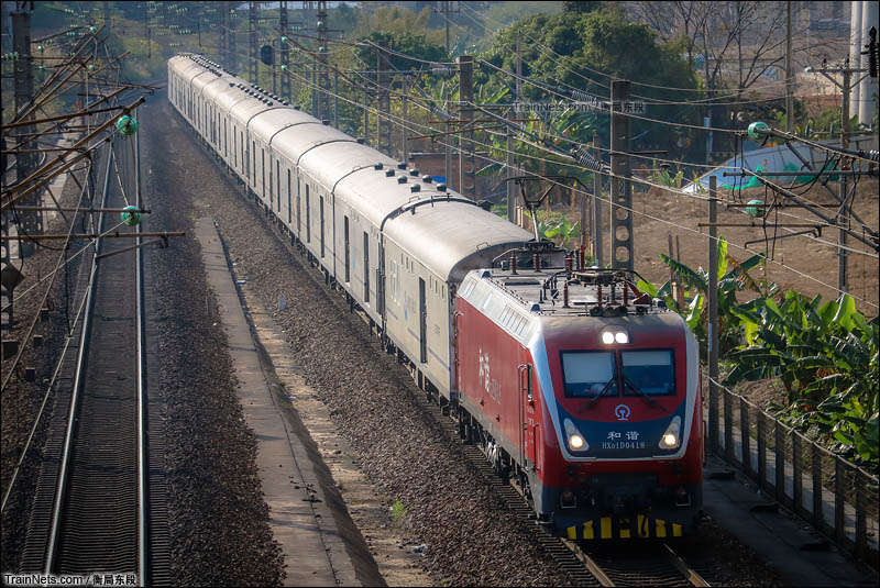 2017年3月2日。广州花都。由广铁广段HXD1D-0418号电力机车担当的X112次(石龙-固安)行邮专列,通过京广线K2235处,即G107线跨线桥。(图/衡局东段)