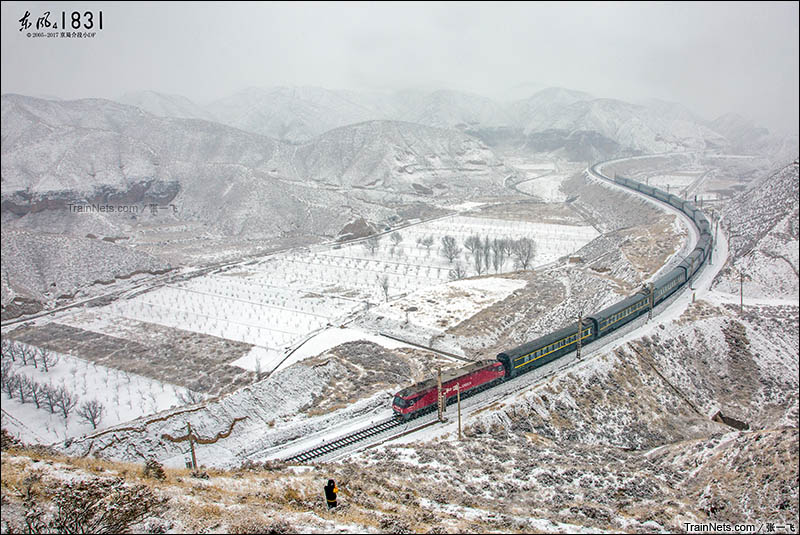 2017年3月12日。甘肃白银。大雪纷飞中,HXD3D牵引Z21次(北京西-拉萨)进藏列车行驶在的包兰线前长川段的经典弯道之中。(图/张一飞)