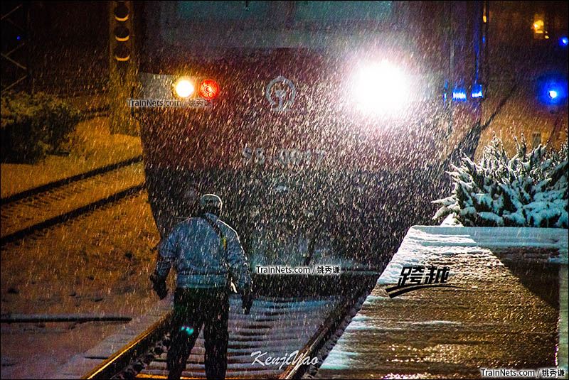 2017年1月31日。徐州站大雪,一名连接员走在准备进房的的SS7E后面。(图/姚秀谦)