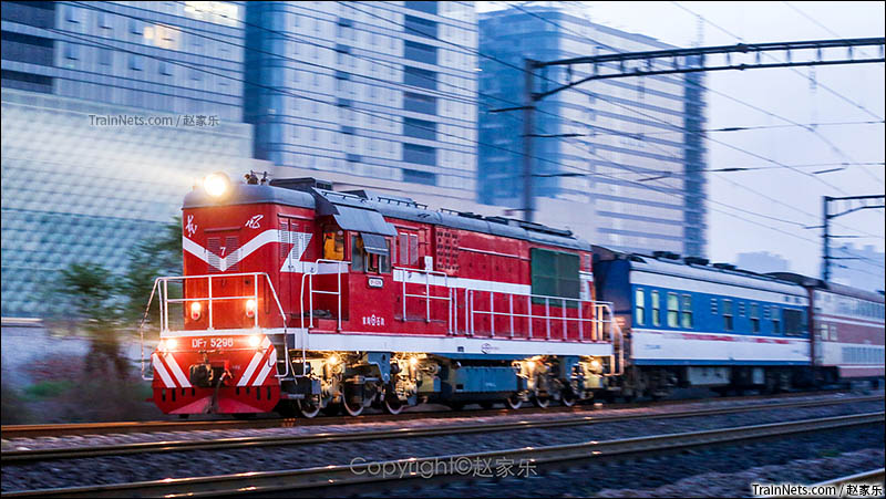 2017年4月。石家庄。牵引末班双层车回库的DF7C,在蓝色发电车的映衬下,红色的车身格外靓丽。(图/赵家乐)