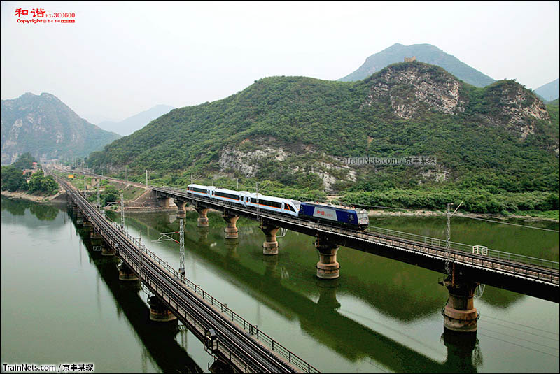 2017年6月21日,HXD3C0747牵引CJ5-0505城际动车组试验车通过薄雾笼罩的落坡岭。此车6月20日小合隆站开行00101次无动力回送呼和浩特。(图/京丰某琛)