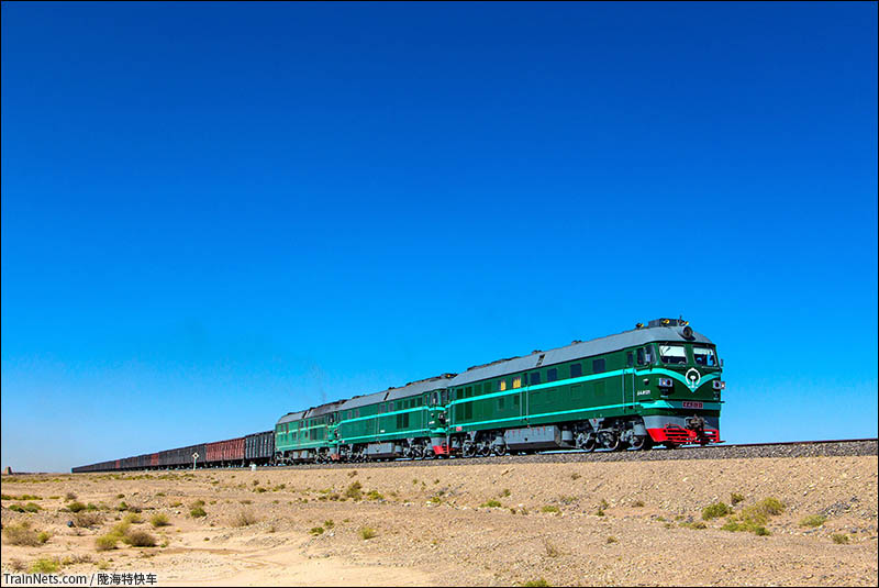 2017年6月10日。嘉策铁路。配属酒钢运输部的三台DF4B内燃机车正重联牵引来自策克口岸的满载煤炭的列车驶过茫茫戈壁前往嘉峪关北站。(图/陇海特快车)