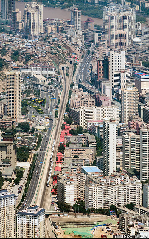 2017年7月13日。兰州市区。运营于中川城际铁路上的两列CRH2G交汇于兰山脚下。远处依稀可见兰州一号和二号隧道。(图/邱和阳)