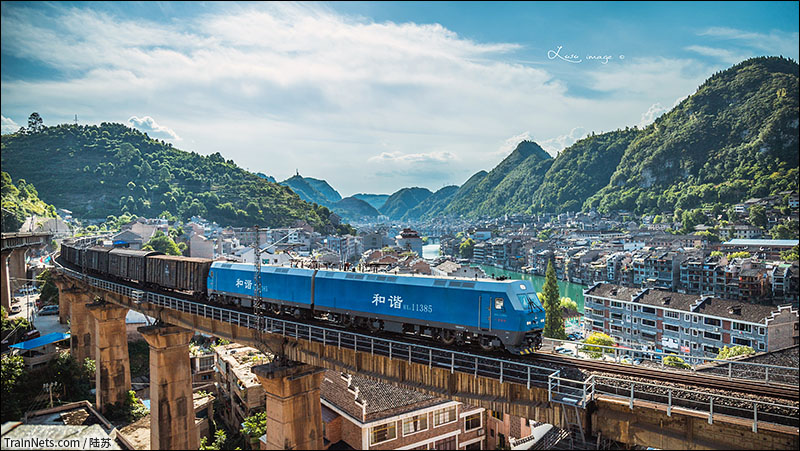 2017年8月。贵州镇远,蓝精灵牵引货列经过镇远古镇。(图/陆苏)