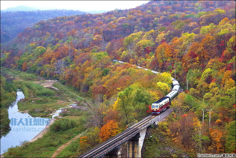 2016年10月5日。浑白线松江河附近。客车即将通过蛤蟆石隧道前的铁路桥,开往松江河站方向。(图/春段村哥)
