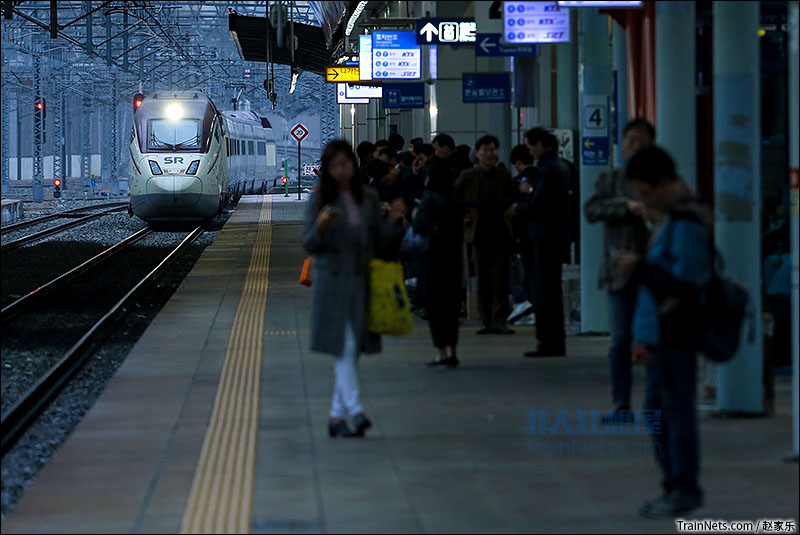 2017年11月10日。韩国铁道株式会社之SRT高速列车在工作日的通勤高峰驶入大田车站。得益于韩国铁道宽松的站台管制,旅客可以自由的在车站付费区内拍摄记录列车接发。(图/赵家乐)