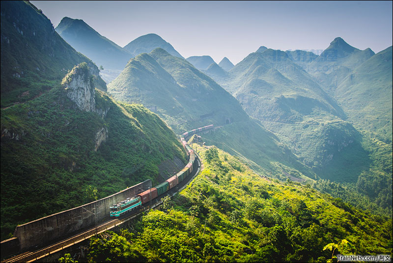 2017年8月。六盘水。SS3牵引货列行驶在云贵高原间的贵昆线上。(图/阿文)