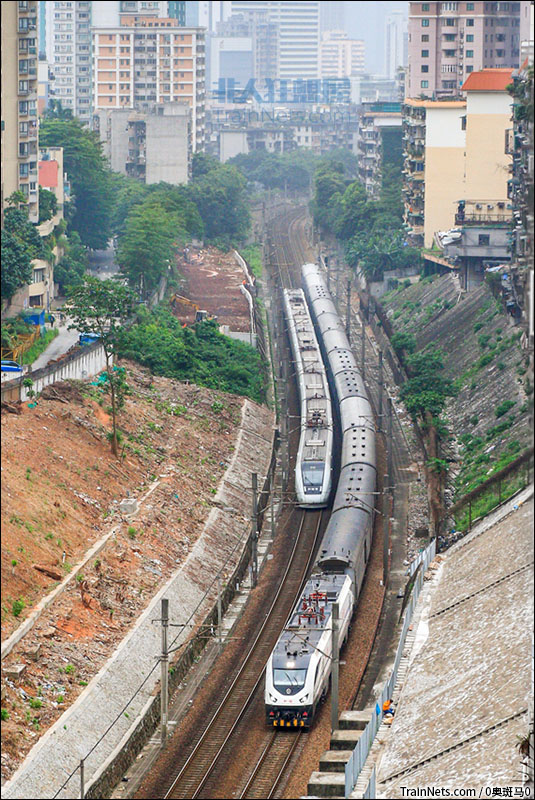 2017年5月20日。广州。HXD1G牵引X111次在广州-广州东区间与广深线CRH1A相会。(图/0奥斑马)