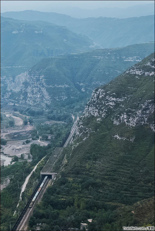 2014年9月。韶山1型电力机车牵引6834次列车通过太岚线扫石车站。(图/李刚)
