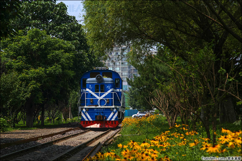 2017年7月19日。DF7-0087穿行在盛夏的北京西郊机场油库专用线小清新林中铁轨上,几个月一次的过车在这条美丽的专用线上尤为珍贵。(图/京丰某琛)