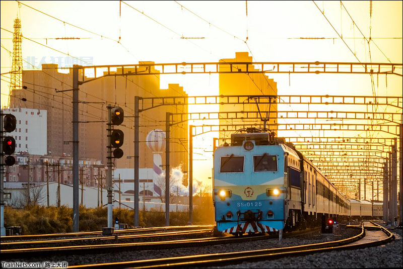 2018年2月2日。傍晚时分,SS8牵引T254次(广州-天津)列车出石家庄北站。2018年4月16日调图后,T253/4改走津霸、霸徐后不再进石家庄北,并改用HXD3D牵引。(图/路上大团)