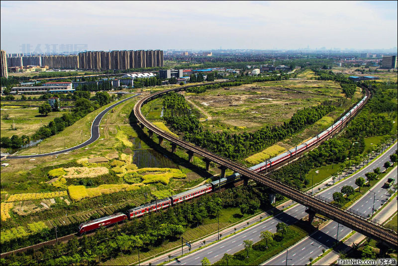 2017年5月13日。上局徐段HXD1D牵引几乎全红的K48次(杭州-齐齐哈尔)通过沪昆线上行太平村附近。(图/苏子涵)
