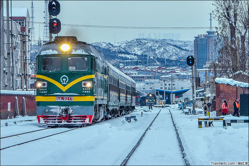 2016年11月。京承线。大雪中的6455次(承德-平泉)悄然驶出承德站。(图/张红洋)