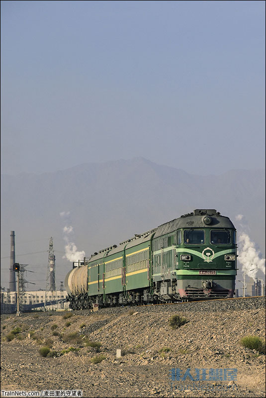 2018年5月14日。嘉策铁路嘉峪关北站(酒钢厂区铁八门)。东风4-0275牵引嘉策铁路通勤列车驶出酒钢厂区铁八门,开往策克口岸方向。(图/麦田里的守望者)