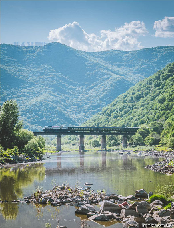 2018年初夏。长图线,沈局吉段DF11牵引牵扯行驶在布尔哈通河谷。(图/阿文)