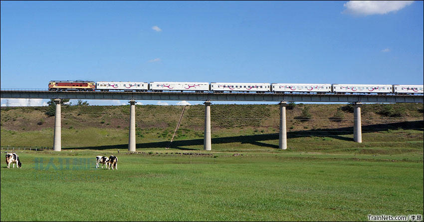 2018年7月14日。蒙古国K23次(北京-乌兰巴托)通过集二线霸王河大桥。(图/李昂)