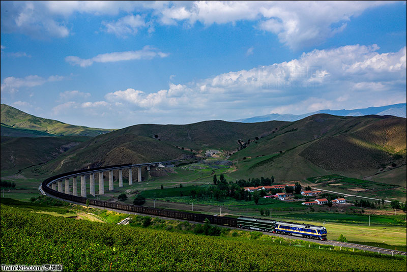2018年7月27日。内蒙古赤峰巴林右旗。DF8B-5810附挂中铁三局第一台赤大白铁路机车DF4-6156牵引煤列行驶在骑里马场。(图/罗靖峰)