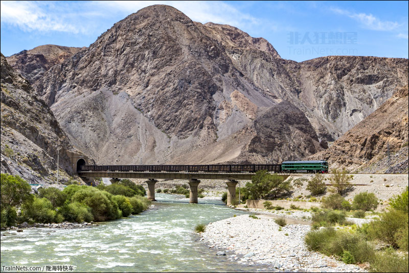 2018年7月。新疆库尔勒。鱼焉铁路的DF4B货车跨域河流。(图/陇海特快车)