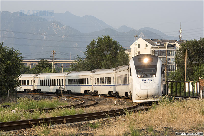 2018年8月。北京。S2线列车接近南口车站,背景为已经铺设完毕的京张高速铁路桥。(图/李刚)