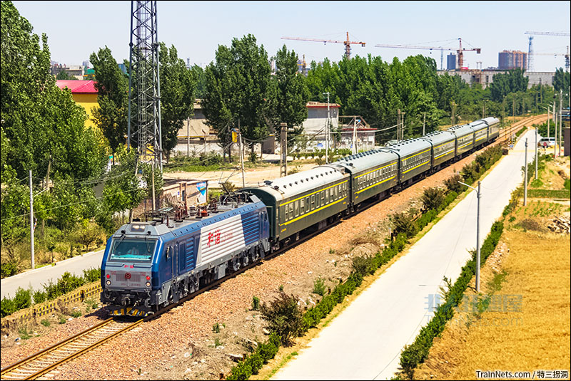 2018年6月5日。汤鹤支线。郑州铁路局新乡机务段HXD2C-0306牵引55005次(溜轴)汤阴站北场6道发车,通过韩庄镇董庄村的一个无人看守道口和1KM标。(图/特三拐洞)