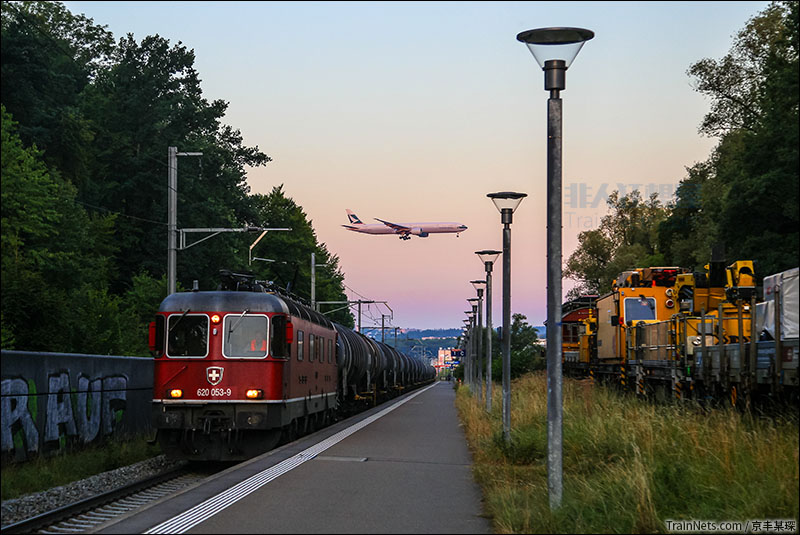 2018年8月9日。瑞士苏黎世,瑞士铁路Re6/6电力机车牵引货列在朝霞的映衬下通过Opfikon(奥普菲孔镇)balsberg站,与侧线的瑞士铁路工程车和即将降落在苏黎世国际机场的国泰航空班机一同定格成了一张空铁联运的作品。(图/京丰某琛)