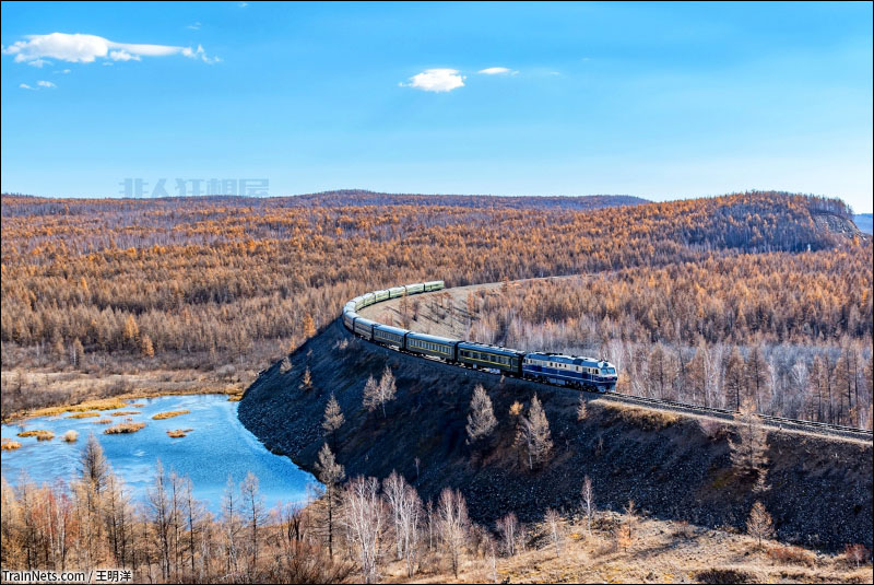 2018年10月3日。牙林线。K7095次(海拉尔-哈尔滨西)列车通过岭北弯道。(图/王明洋)