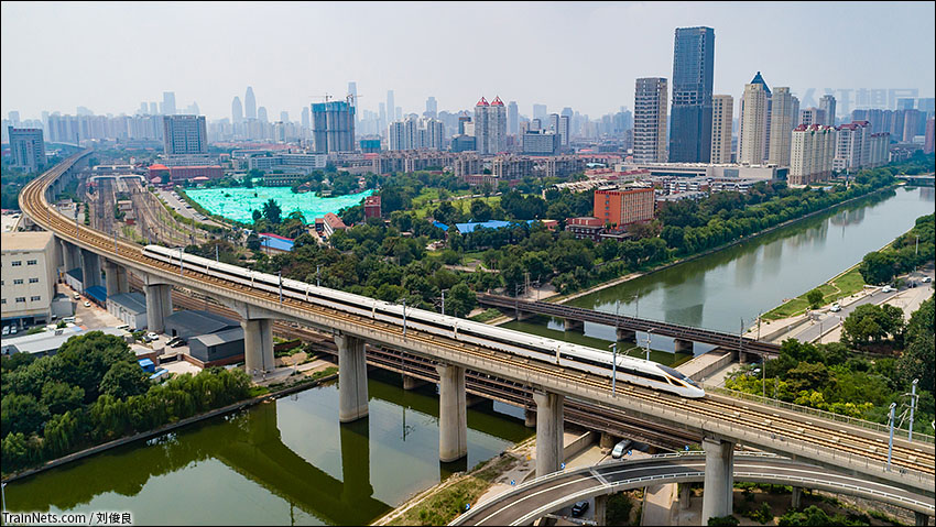 2018年8月8日。天津。CR400BF动车组行驶在京津城际铁路上,驶过新开河。这一天,京津城际铁路恢复时速350公里运行。(图/刘俊良)