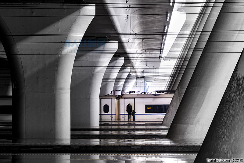 2015年11月。空荡荡的杭州东站里一列CRH380B正在缓缓启动。爸爸和儿子却不急着离去,父子两人一起好奇地望着眼前不断加速的动车,用心感受速度与激情。(图/吕杰琛)