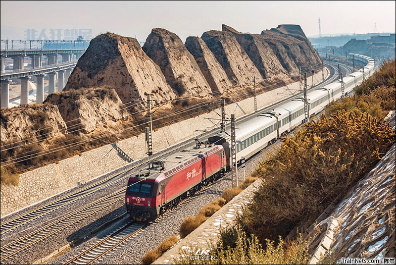 2017年元旦。兰新线下官营站。抖三抖牵引全白的Z151次(北京西-西宁)驶向兰州。侵蚀留下的黄土包形成了有趣的小场景。(图/陈然)