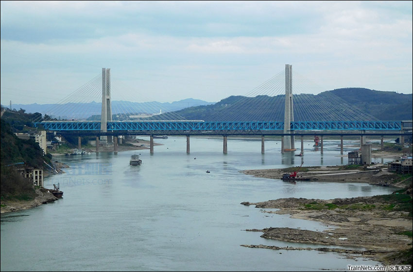 2019年2月。运行在渝贵线新白沙沱长江特大桥上的重联动车与驶上川黔线白沙沱长江大桥上的SS3B货列。(图/火车天下)