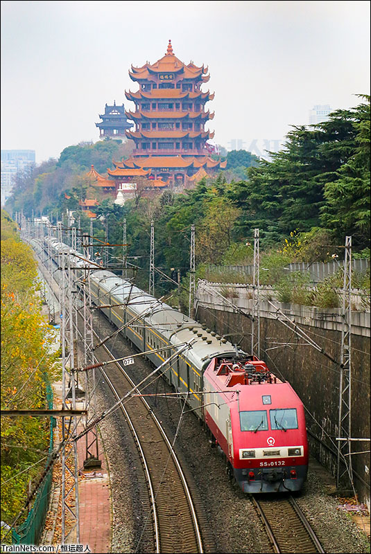 2018年12月9日。武汉。SS9G牵引客车飞驰在黄鹤楼下。(图/恒运超人)