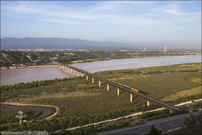 2018年8月。南同蒲铁路。内燃橘子牵引客车通过风陵渡桥。(图/黄镇)