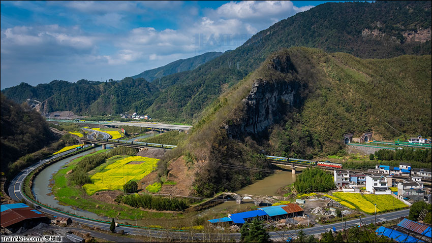 2019年3月23日。皖赣铁路。K46次(福州-北京)穿行于安徽宣城十里岩奇特地貌,正值春季,皖赣铁路两侧盛开着金黄的油菜花。(图/罗靖峰)