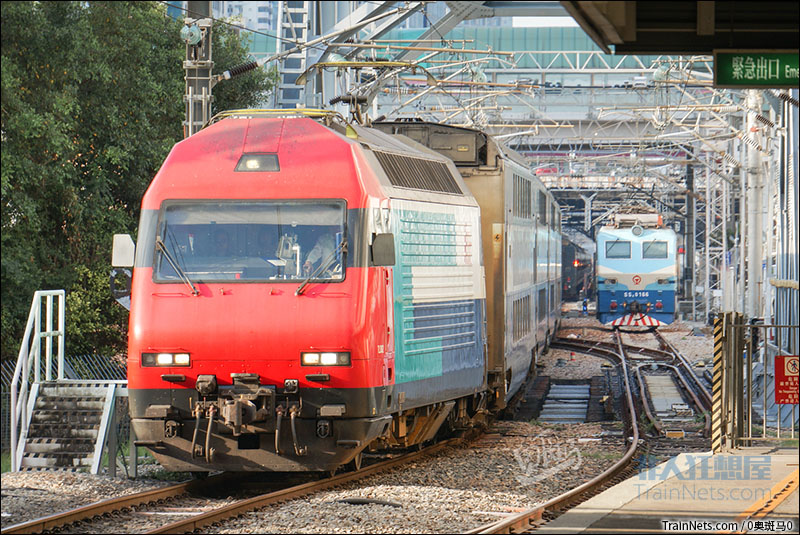 2019年2月14日。香港罗湖站。九广通KTT执行Z825次(广州东-香港红磡)在SS8-0166新世纪金龙号的注视下驶过罗湖桥,前往终点红磡。(图/0奥斑马0)