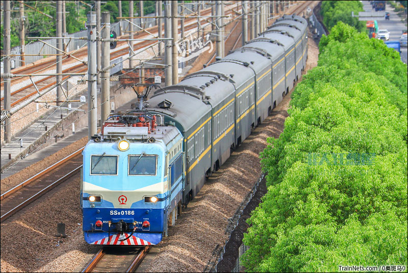 2018年7月22日。东莞横沥。SS8-0186牵引Z98次(香港红磡-广州东/北京西)飞驰在广深线上。(图/0奥斑马0)