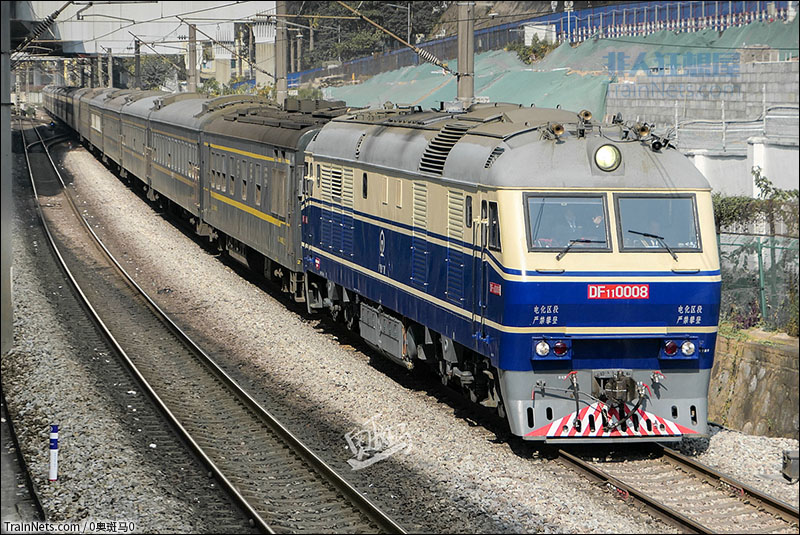 2019年1月25日。广州。DF11-0008牵引列车行驶在广州-广州东联络线上,从背景中可见射击场道口平改立工程已开始进行。(图/0奥斑马0)