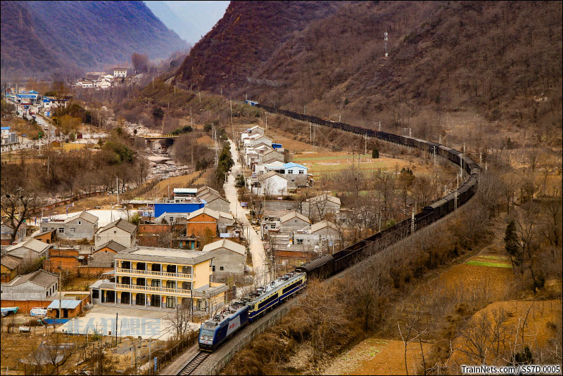 2019年1月28日。宝成线杨家湾至任家湾区间。担当本务的西局新段SS4-0024与担当前后补机的西局新段两台HXD3推挽运行牵引货列慢速驶下秦岭。(图/SS7D 0005)
