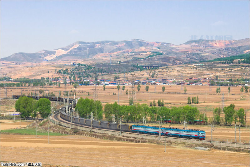 2019年5月4日。神华双机SS4B牵引KM98煤炭漏斗车通过神朔铁路南坡底-神池南区间。(图/路上大团)