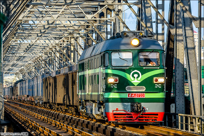 2019年1月13日。“开口瓜0733”牵引混编货物快速通过珠江大桥。(图/张儆)