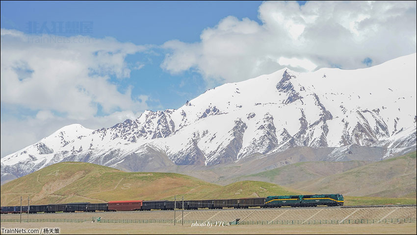 2019年7月21日。下行货列接近玉珠峰站,列车缓缓行驶在巍峨的昆仑山下,云开雾散后冰川终于露了出来。