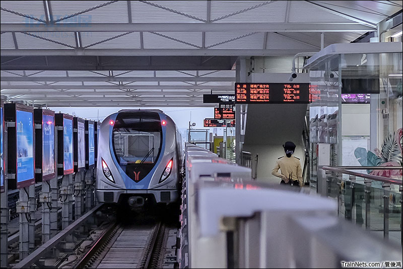 2019年5月。广东增城,广州地铁21号线列车驶离朱村车站。