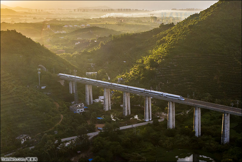 2019年8月。海南三亚。从三亚开出的首班环岛城际列车即将穿过三亚“岭夹岭”山。