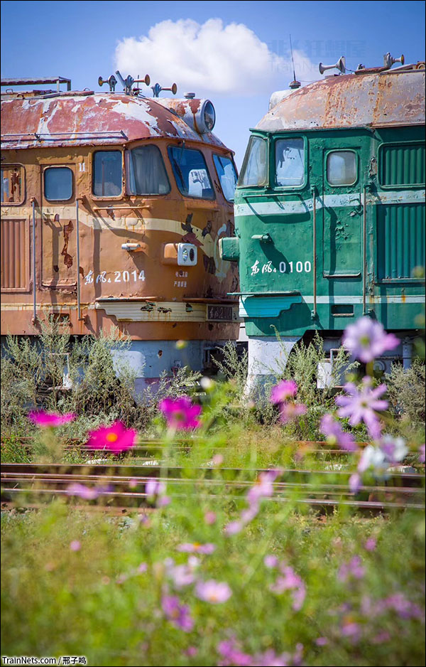 2019年9月。巴新铁路铺架基地。分别生产于1975年和1976年的东风4-2014号和100号机车在波斯菊和蓝天白云的衬托下依旧飒爽英姿精神抖擞。